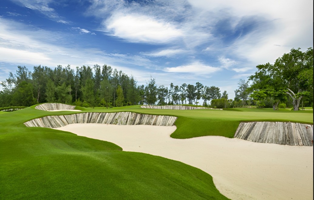 Aquella Golf & Country Club, nestled along the pristine Andaman Sea in Phang Nga, offers a luxurious golf experience amidst breathtaking scenery. This premier destination spans 1.8 million square meters with a private 2.5-kilometer beachfront and boasts an array of world-class amenities, including a resort hotel, pool villas, a marina, and a beach club. The 18-hole championship golf course, redesigned in 2021 by Pacific Coast Design, features stunning views, particularly at the signature 186-yard par-three eleventh hole. Aquella's modern clubhouse, with its upscale facilities and casual atmosphere, makes it a top choice for both avid golfers and resort visitors. Combining challenging play with scenic beauty, Aquella is a must-visit for golfers looking to explore Thailand's hidden gems.
