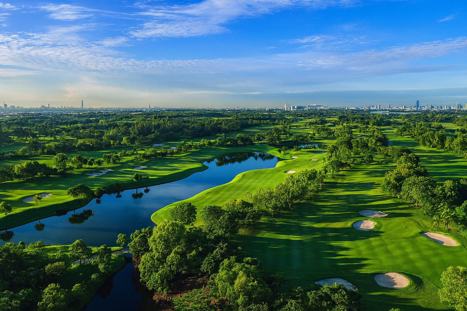 Riverdale Golf Club, a premier golf destination in Bangkok designed by Jonathan Morrow and Al Tikkanen. Renowned for its intelligent routing and elevation changes, Riverdale offers a unique challenge for golfers of all skill levels. The course features beautifully manicured fairways, small reed-lined lakes, and strategically placed bunkers, creating an engaging play experience. Though the surrounding landscape includes factories and villages, the course itself boasts stunning views and an inviting atmosphere. After navigating its subtly breaking greens, relax at the contemporary clubhouse overlooking the 10th and 18th holes. With top-notch locker facilities and refreshments available, Riverdale embodies the elegance of a five-star private golf club.